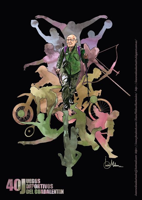 Con esta ilustración he querido expresar el carácter popular de los juegos deportivos del Guadalentín. He elegido una figura central representada por una persona mayor realizando senderismo, una de las pruebas más populares de las que se realizan, su edad refleja el paso del tiempo tras 40 años de los mismos. A su alrededor aparecen distintas siluetas que surgen como reflejos del protagonista y que representan algunas de las pruebas deportivas que forman el conjunto de los juegos, entre ellas podemos distinguir voleibol, natación, baloncesto, tiro con arco, ciclismo, futbol, maratón, gimnasia rítmica, tenis, motocross o ajedrez.