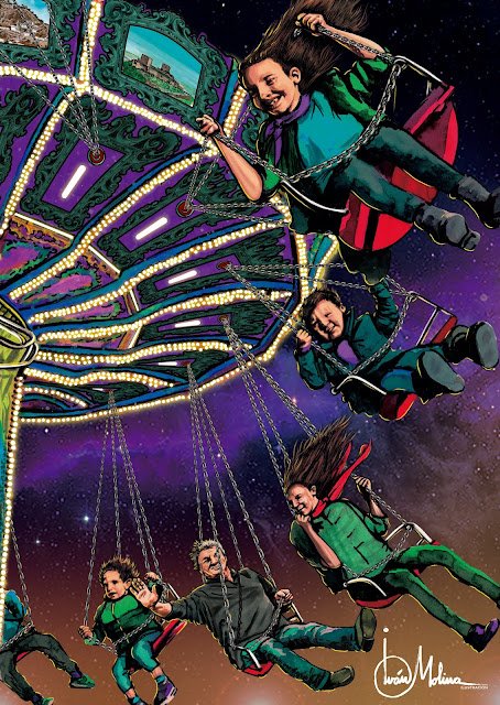 Un carrusel iluminado y ornamentado con imágenes de la ciudad sirve como punto de enlace y ejerce el movimiento que impulsa a seis personas de diferentes edades y género que vuelan sobre un cielo estrellado desde el que se intuye más actividad festiva por el resplandor anaranjado que surge de su zona inferior.